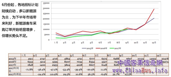 預(yù)計2017年5米以上公交客車銷量9萬—9.5萬輛,同比下降20%—25%左右。其中新能源公交客車將達到7萬輛左右,同比下降30%。