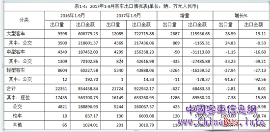 1—9月份,出口各類客車21724輛,出口金額92.29億人民幣,出口量比上年同期下降2.81%,出口額增長8.01%。其中,大中型客車出口16384輛,同比增長19.18%,出口金額87.91億人民幣,同比增長10.68%。