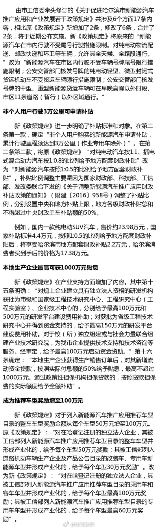 新修訂的《關(guān)于促進(jìn)哈爾濱市新能源汽車推廣應(yīng)用和產(chǎn)業(yè)發(fā)展若干政策規(guī)定》近期實(shí)施。新《政策規(guī)定》共涉及6個(gè)方面17條,包括新能源汽車在市區(qū)內(nèi)行駛不受車輛號(hào)牌尾號(hào)限行措施限制;對(duì)新能源汽車按照1:0.5的比例給予地方配套財(cái)政補(bǔ)貼等內(nèi)容。