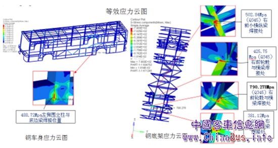 在結(jié)構(gòu)輕量化方面,黃海客車研究院項(xiàng)目負(fù)責(zé)人組織研討整車方案的布置、前后橋的選配、減重對車身骨架強(qiáng)度的影響、結(jié)構(gòu)降成本等工作,為了能夠使結(jié)構(gòu)最優(yōu)、成本最低并減少工裝使用量,利用與12米車輛的CAE分析對比,將電池倉及地板梁等多處的異型管取消,用高強(qiáng)度鋼替換了原有的普通鋼材,并在重點(diǎn)承受應(yīng)力結(jié)構(gòu)的位置進(jìn)行了加強(qiáng),確保了整車強(qiáng)度,同時也對內(nèi)飾件、座椅等進(jìn)行了輕量化選配,整車同比降重15%,同時降低了能耗、降低了成本。