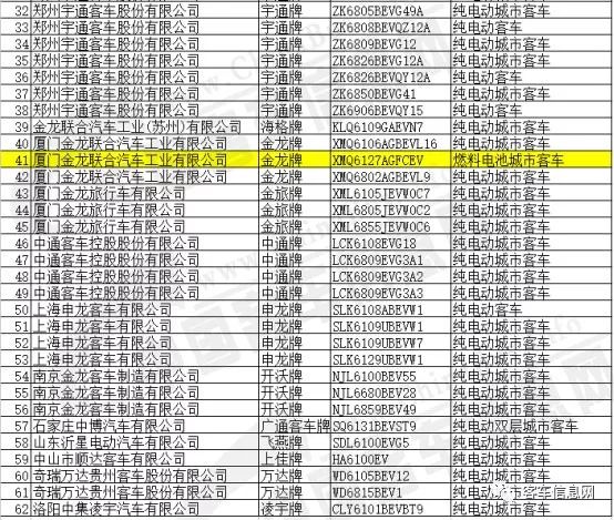 據中國客車信息網統計,本批新能源車型目錄中共包括客車產品62款,其中包括純電動客車56款,插電式混合動力客車4款,燃料電池客車2款。2款燃料電池客車分別來自鄭州宇通和廈門金龍,產品型號為宇通ZK6125FCEVG6和金龍XMQ6127AGFCEV車型。