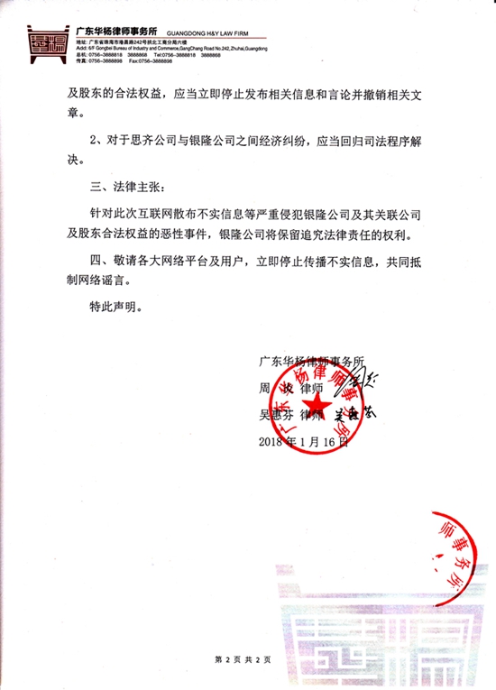 銀隆公司發(fā)律師聲明:不存在惡意拖欠貨款問題