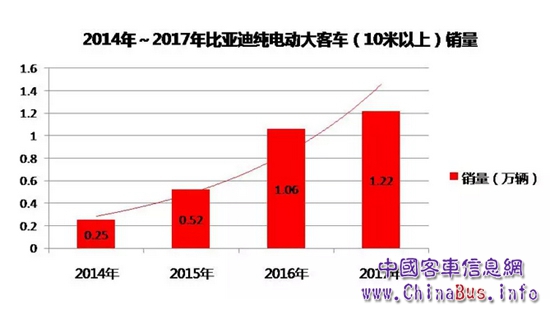 事實上,比亞迪客車一直穩(wěn)居行業(yè)前列。2016年,比亞迪以13278輛的銷量位居行業(yè)第三;2017年,得益于整體銷量與市場占有率“雙增長”的出色業(yè)績,比亞迪行業(yè)排名再次晉級,位居行業(yè)第二。