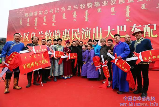 1月21日下午三時許,呼和浩特烏蘭恰特廣場,零下八度,天空不時飄著小雪。雖是寒冬臘月,現(xiàn)場氣氛卻異常熱烈。烏蘭牧騎的隊員們身著靚麗的民族服飾,滿懷喜悅等待著迎接他們的專屬“坐騎”——為他們量身定制的金龍客車演出大巴。