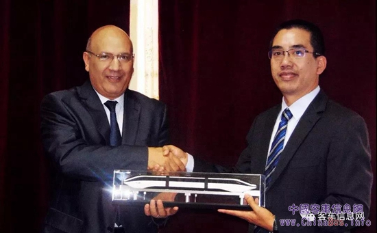 去年10月,比亞迪中東非洲汽車銷售事業(yè)部總經(jīng)理黃志學(xué)(右)將云軌模型贈(zèng)與埃及亞歷山大客運(yùn)局長Khaled Eleiwa