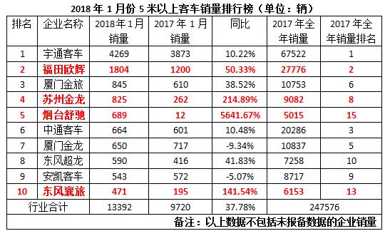 此外,前十名中,同比增幅超過50%的還有東風(fēng)襄旅,1月份實(shí)現(xiàn)5米以上客車銷售471輛,同比大增141.54%,相對(duì)2017年全年銷量排名提升3位。