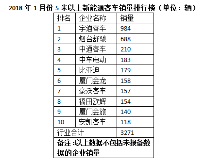 從排行榜可以看出,2018年1月份,宇通客車實(shí)現(xiàn)5米以上客車銷售4269輛,同比增長10.22%,繼續(xù)穩(wěn)居行業(yè)第一位。同時(shí),宇通5米以上新能源客車實(shí)現(xiàn)銷售984輛,同樣穩(wěn)居行業(yè)第一位。