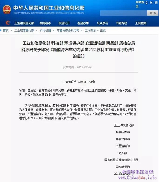 第四條 工業(yè)和信息化部會同科技部、環(huán)境保護部、交通運輸部、商務(wù)部、質(zhì)檢總局、能源局在各自職責范圍內(nèi)對動力蓄電池回收利用進行管理和監(jiān)督。