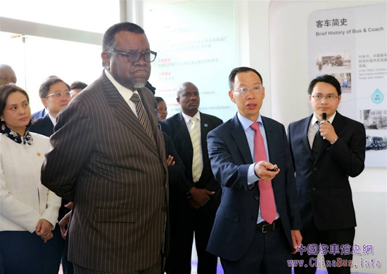 4月1日下午,納米比亞總統(tǒng)根哥布一行在中國駐納米比亞大使張益明,江蘇省副省長、省公安廳廳長劉旸,蘇州市副市長、市公安局局長江海,蘇州市副市長金潔,蘇州工業(yè)園區(qū)管委會(huì)主任周旭東等陪同下,到海格客車參觀訪問,受到了海格客車總經(jīng)理黃書平的熱情接待。
