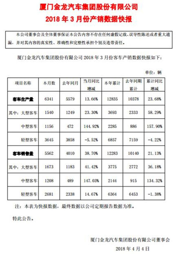 4月4日,廈門(mén)金龍汽車集團(tuán)股份有限公司披露產(chǎn)銷數(shù)據(jù)快報(bào),數(shù)據(jù)顯示,金龍汽車3月銷售各類客車5562輛,同比增長(zhǎng)38.70%;3月份生產(chǎn)各類客車6341輛,同比增長(zhǎng)13.66%;