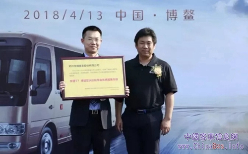 宇通T7榮獲“博鰲亞洲論壇年會優(yōu)質(zhì)服務車輛”稱號,左為宇通客車國內(nèi)營銷總監(jiān)丁鼎