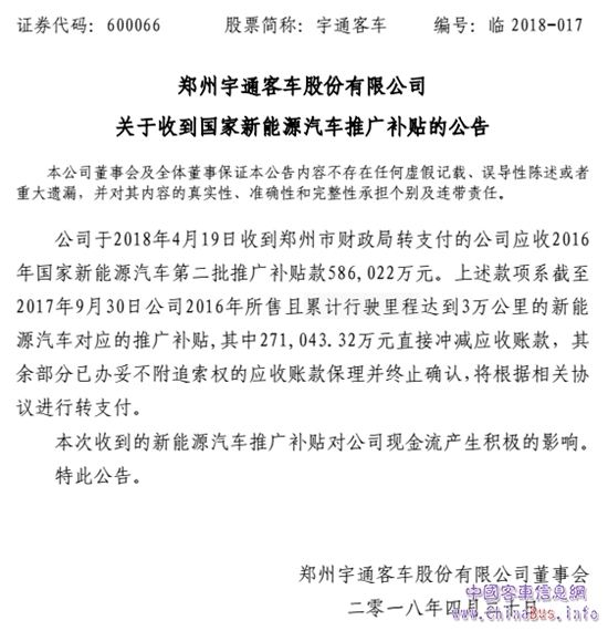 4月23日,鄭州宇通客車股份有限公司發(fā)布“關(guān)于收到國(guó)家新能源汽車推廣補(bǔ)貼的公告” (以下簡(jiǎn)稱公告)。公告稱,公司于2018年4月19日收到鄭州市財(cái)政局轉(zhuǎn)支付的公司應(yīng)收2016年國(guó)家新能源汽車第二批推廣補(bǔ)貼款586,022萬(wàn)元。系截至2017年9月30日公司2016年所售且累計(jì)行駛里程達(dá)到3萬(wàn)公里的新能源汽車對(duì)應(yīng)的推廣補(bǔ)貼。