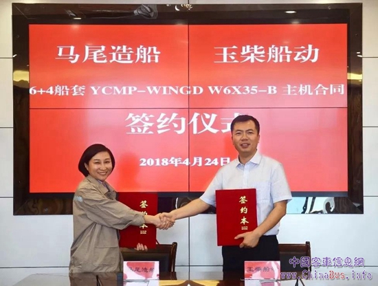 4月24日,玉柴集團(tuán)旗下的玉柴船舶動(dòng)力股份有限公司與福建省馬尾造船股份有限公司簽訂了20臺(tái)YCMP-WINGD W6X35-B低速柴油機(jī)的合同,這批主機(jī)將裝配于采用雙機(jī)雙槳設(shè)計(jì)的23500噸油化船上。