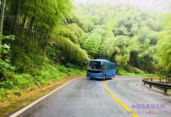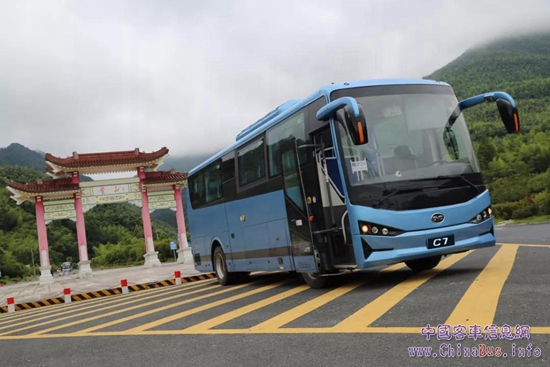 6月中旬,比亞迪C7純電動客車駛?cè)朦S山,在層巒疊嶂間開啟了一段艱險(xiǎn)征途。