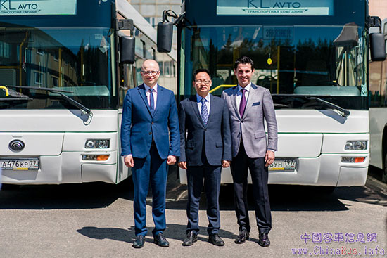 宇通客車海外市場(chǎng)總經(jīng)理胡懷班(中)與KLavto負(fù)責(zé)人在車前合影