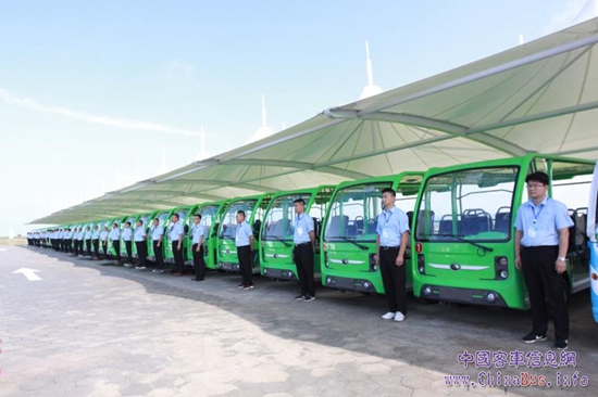 35輛身著“綠裝”的宇通純電動(dòng)旅游觀光車猶如“護(hù)花使者”,威武整齊地排列著......