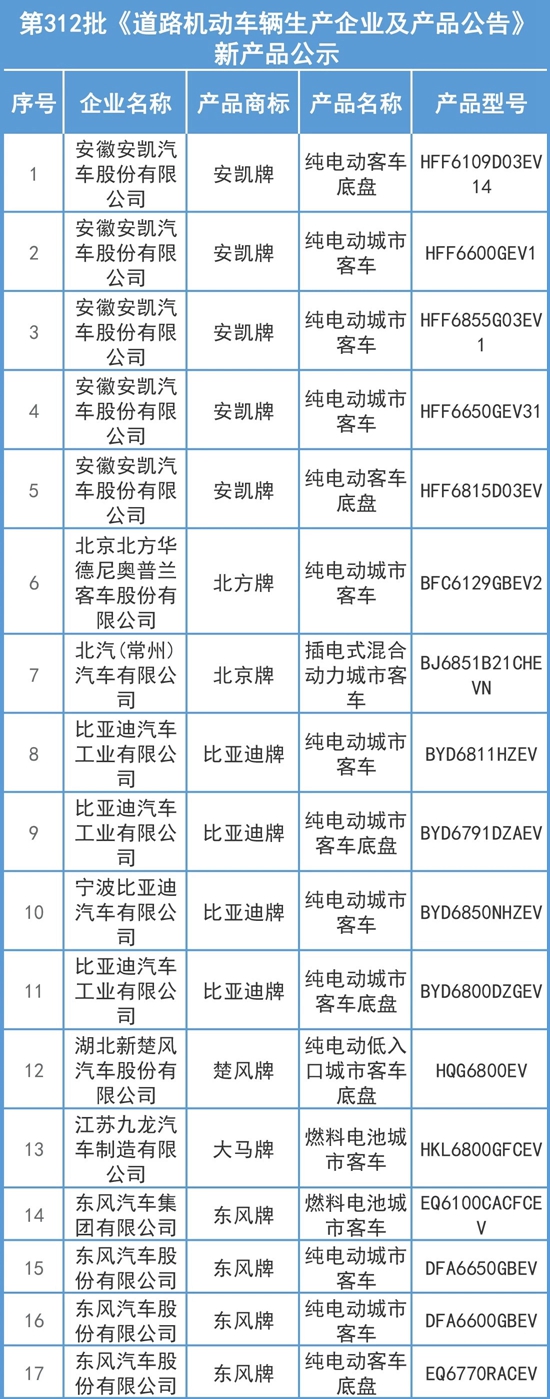 附:第312批《道路機(jī)動車輛生產(chǎn)企業(yè)及產(chǎn)品公告》新產(chǎn)品公示(客車部分)