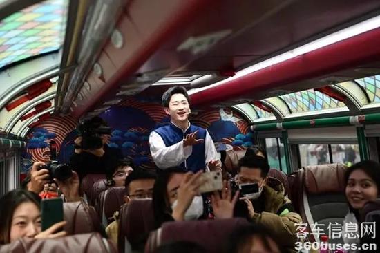2023年2月10日,中國(guó)國(guó)內(nèi)首輛雙層話劇巴士在成都亮相,首批乘客在公交車上欣賞了一臺(tái)沉浸式的喜劇。這輛話劇巴士從春熙路出發(fā),途經(jīng)大慈寺、城市音樂廳、九眼橋、東風(fēng)大橋等成都地標(biāo)景點(diǎn),乘客可以一邊坐巴士,一邊看話劇。該車將于2月14日正式上線。(中新社記者 張浪 攝)