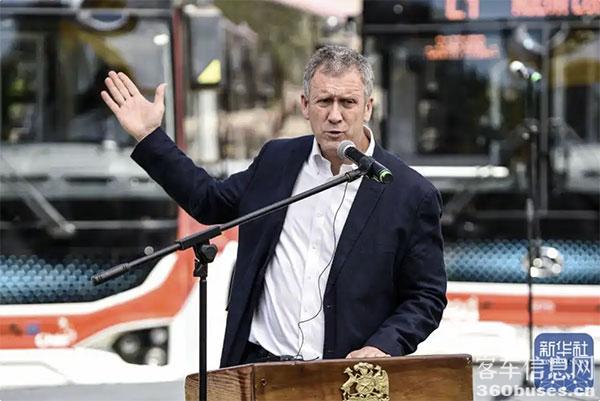 ↑10月16日,在智利科皮亞波,智利交通和電信部長(zhǎng)胡安·卡洛斯·穆尼奧斯在新能源公交車(chē)輛啟用儀式上講話。