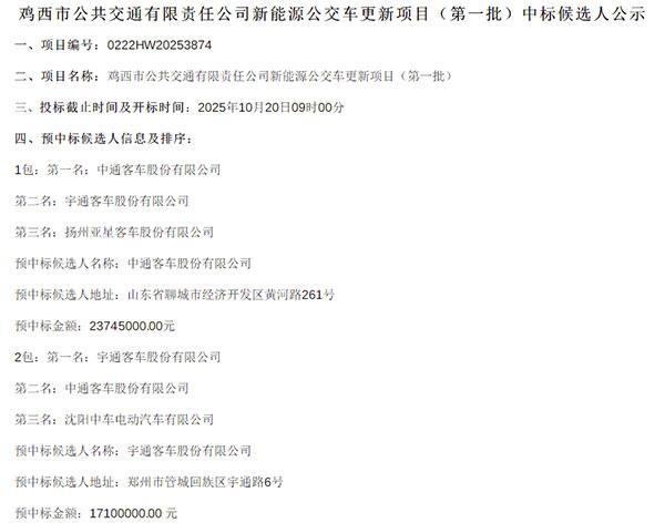 2025年10月20日,黑龍江省雞西市公共交通有限責(zé)任公司新能源公交車更新項(xiàng)目(第一批)中標(biāo)候選人公示發(fā)布。該項(xiàng)目共劃分3個(gè)標(biāo)包,共采購125輛新能源公交車。其中,1包 50 輛,預(yù)中標(biāo)候選人為中通客車股份有限公司;2 包36輛,預(yù)中標(biāo)候選人為宇通客車股份有限公司;3 包39輛,預(yù)中標(biāo)候選人為沈陽中車電動汽車有限公司。公告期限為2025年10月20日到2025年10月23日。