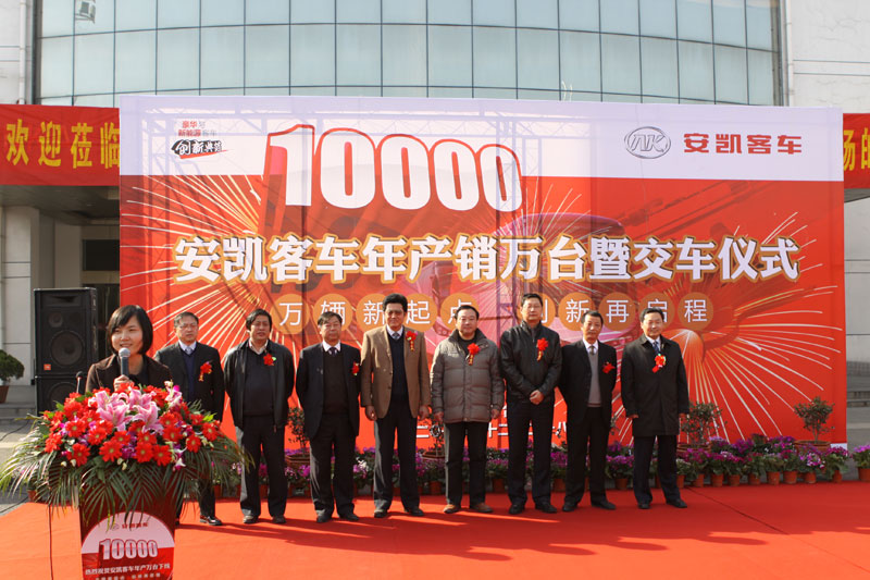 12月28日上午,安凱汽車“年產(chǎn)萬輛慶典儀式”隆重舉行,合肥市市委書記孫金龍、省國資委主任許崇信,省發(fā)改委副主任施平、合肥市副市長吳春梅等領導出席慶典,隨著孫金龍書記啟動車輛下線儀式按鈕,安凱客車2010年第一萬輛客車正式下線。