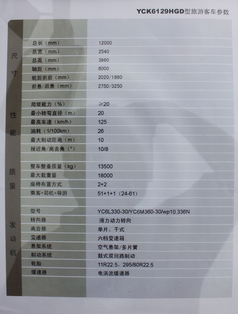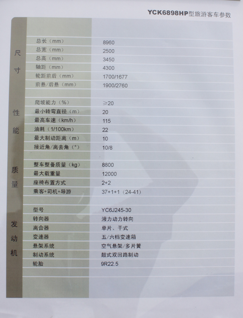YCK6128HEC純電動客車融西方典雅風情與東方神韻于一體,造型極富時代氣息。流線型車身設計,簡潔明快亮麗,前圍造型飽滿,駕駛員視野開闊,加大的側窗,景觀效果俱佳,大視野除霜后視鏡提高了行車的安全性及美觀性。該款客車的多項指標優(yōu)于國家標準,一次充電可持續(xù)行駛500公里,充放次數(shù)大于1000次,最高車速可達110km/h,最大爬坡不小于20度,并能夠在客車行駛過程中實現(xiàn)能量的回收。