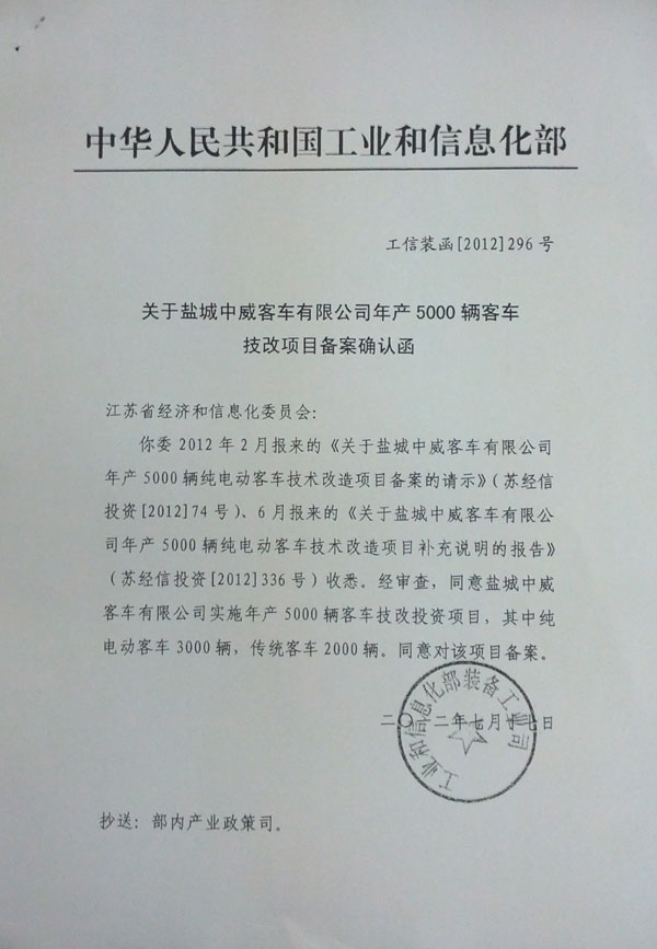 2012年7月,中大新能源純電動客車5000臺技改立項率先獲得國家工信部報備批準。這是對加快中大新能源客車發(fā)展步伐,促進中大汽車轉型升級產業(yè)擴張的強力推動。此舉對于加快中大純電動客車產業(yè)化步伐,促進中大汽車轉型升級具有重要的意義。[詳細]【工信裝函[2012]296號】