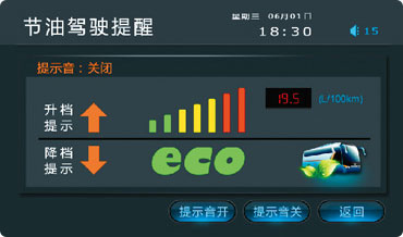 ECO-driving安裝在儀表臺(tái)醒目位置,通過唯一的一個(gè)"ON/OFF"按鍵可以實(shí)現(xiàn)開啟、靜音或關(guān)閉系統(tǒng)三個(gè)功能。在開啟的情況下,當(dāng)車輛運(yùn)行的燃油經(jīng)濟(jì)性良好時(shí),系統(tǒng)的"ECO"指示燈會(huì)亮起;當(dāng)駕駛員在操作中出現(xiàn)檔位不合理的狀況時(shí),系統(tǒng)會(huì)點(diǎn)亮提示"升檔"或"降檔"的圖標(biāo),同時(shí)發(fā)出語音提醒;系統(tǒng)還設(shè)有階梯狀瞬時(shí)油耗提醒燈帶,分七個(gè)等級(jí)對(duì)當(dāng)前車輛百公里油耗進(jìn)行定性提示。