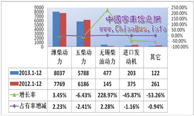 從發(fā)動(dòng)機(jī)企業(yè)來(lái)看,中國(guó)客車信息網(wǎng)統(tǒng)計(jì)顯示,2013年大型公路客車濰柴動(dòng)力累計(jì)銷售8037輛,同比增長(zhǎng)3.45%,占據(jù)市場(chǎng)份額的55%;玉柴動(dòng)力累計(jì)銷售5788輛,同比下滑6.43%,占據(jù)市場(chǎng)份額的40%;進(jìn)口發(fā)動(dòng)機(jī)合計(jì)銷售203輛,同比下滑高達(dá)45.87%,僅占市場(chǎng)份額的1.4%。