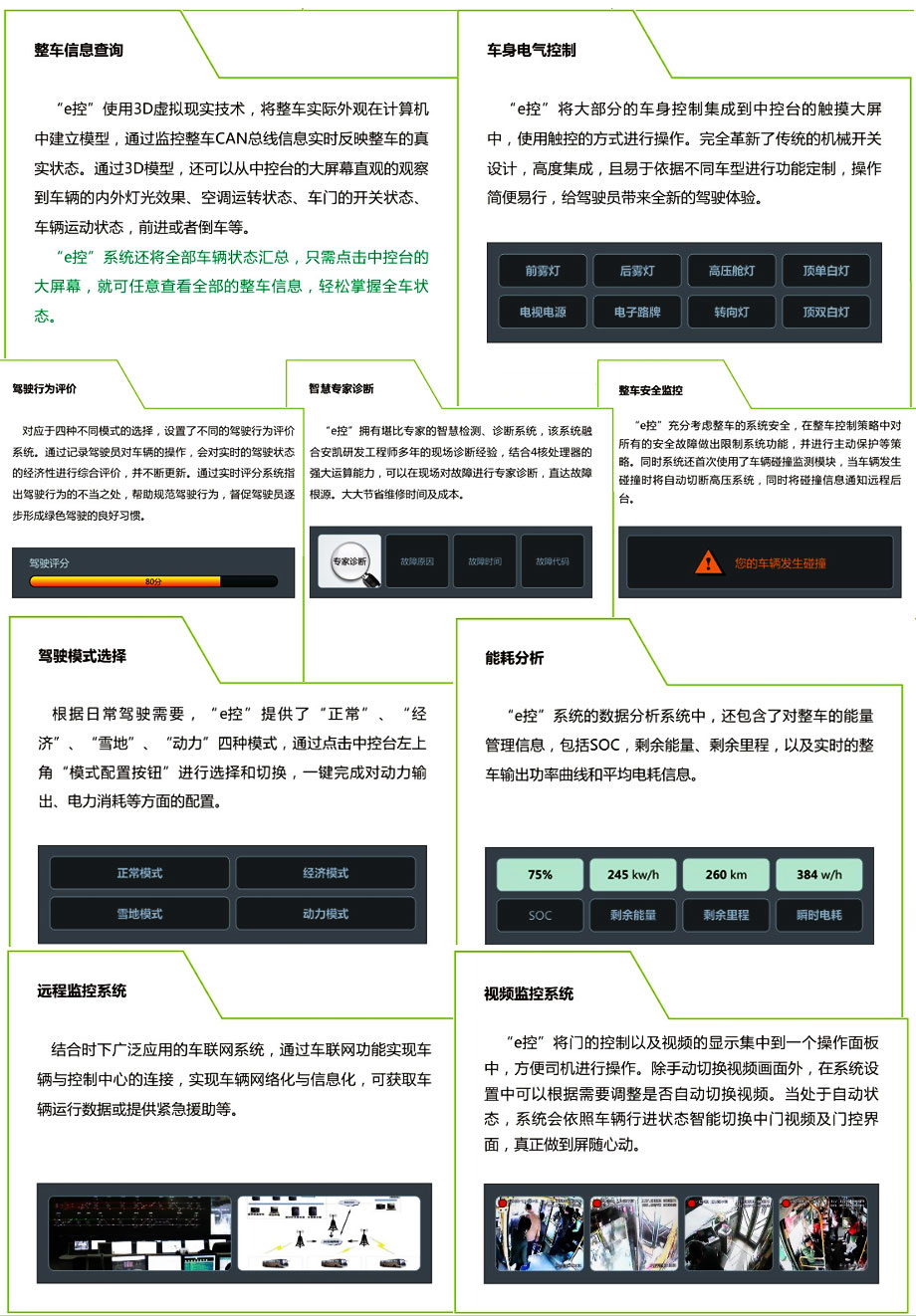 安凱新能源“e控”系統(tǒng)是安凱卓越電管理系統(tǒng)(I-EMS)的全面升級(jí),以“整車控制系統(tǒng)”、“電機(jī)驅(qū)動(dòng)系統(tǒng)”和“能量管理系統(tǒng)”為基礎(chǔ),集合操控人性化、安全多層化、功能智慧化三大特點(diǎn),通過電容多點(diǎn)觸控式交互操作,帶來科技、舒適的駕乘體驗(yàn),引領(lǐng)中國(guó)新能源客車全面進(jìn)入智能大屏?xí)r代。