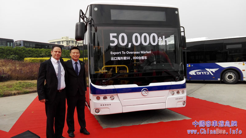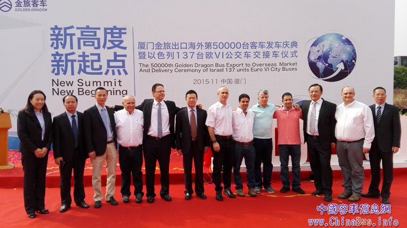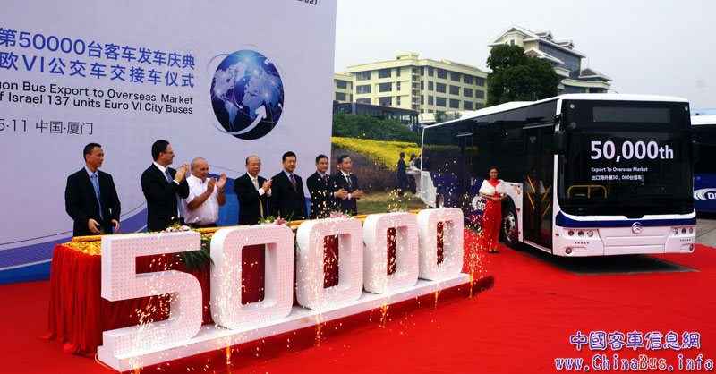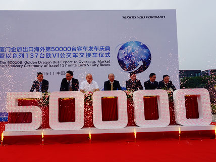 11月30日,廈門(mén)金旅第50000輛客車(chē)出口海外發(fā)車(chē)慶典暨以色列137輛歐VI公交車(chē)交接車(chē)儀式在廈門(mén)金旅海滄基地隆重舉行。這標(biāo)志著廈門(mén)金旅成為國(guó)內(nèi)大中型客車(chē)業(yè)為數(shù)不多海外出口總量突破5萬(wàn)輛的企業(yè)之一。