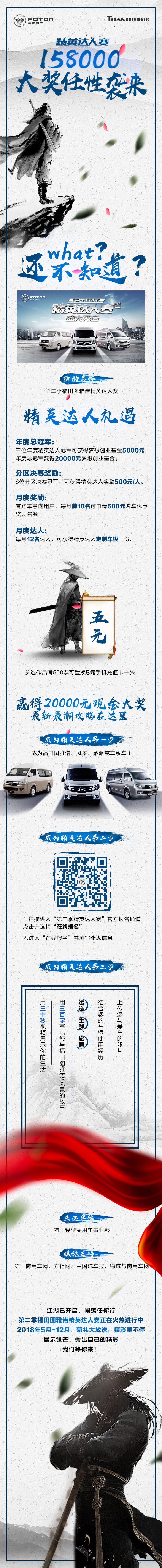 ★ 2017年5月—12月,關(guān)注福田商務(wù)汽車微信公眾號,點擊“活動促銷”欄 ,選擇“精英達(dá)人賽”即可進(jìn)入活動界面,或直接通過線下經(jīng)銷商二維碼掃描,進(jìn)入報名通道。