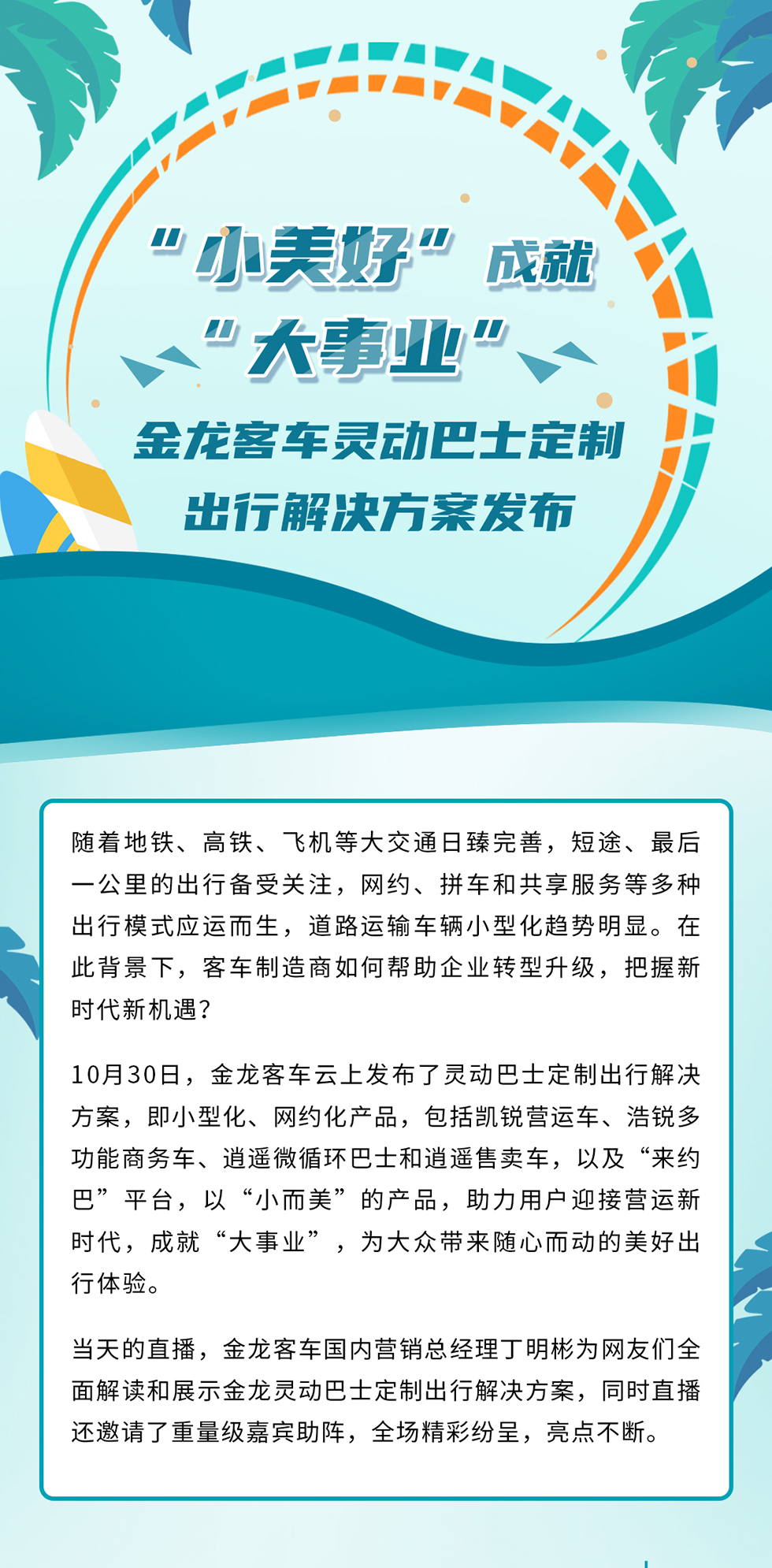 10月30日,金龍客車云上發(fā)布了靈動巴士定制出行解決方案,即小型化、網(wǎng)約化產(chǎn)品,包括凱銳營運車、浩銳多功能商務車、逍遙微循環(huán)巴士和逍遙售賣車,以及“來約巴”平臺,以“小而美”的產(chǎn)品,助力用戶迎接營運新時代,成就“大事業(yè)”,為大眾帶來隨心而動的美好出行體驗。