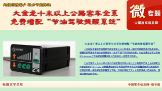繼2011年11月起在國(guó)內(nèi)市場(chǎng)10米以上公路客車產(chǎn)品上全線標(biāo)配業(yè)內(nèi)首創(chuàng)的ECO-driving節(jié)油駕駛提醒系統(tǒng)之后,大金龍?jiān)俅瓮瞥龀捣?wù)回饋客戶—... 更多>>
