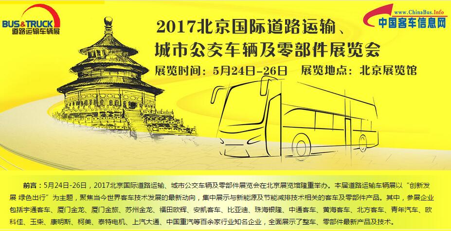 5月24日-26日,2017北京國際道路運(yùn)輸、城市公交車輛及零部件展覽會在北京展覽館隆重舉辦。本屆道路運(yùn)輸車輛展以“創(chuàng)新發(fā)展 綠色出行”為主題,聚焦... 更多>>