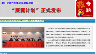 2011年12月16日,廈門金龍汽車集團(tuán)股份有限公司在北京中國(guó)國(guó)家會(huì)議中心召開新聞發(fā)布會(huì),正式宣布進(jìn)軍車聯(lián)網(wǎng)并對(duì)外發(fā)布其核心戰(zhàn)略——“展翼計(jì)劃”。... 更多>>
