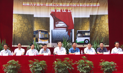 日前,桂林大宇客車有限公司內(nèi)鼓樂喧天,喜氣洋洋,桂林大宇客車與桂林公交集團城市客車聯(lián)合研發(fā)基地揭牌儀式在這里隆重舉行。桂林市經(jīng)委、交通局、桂林公交集團和桂林大宇的領(lǐng)導共同為新基地揭牌。