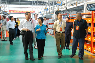 圖為客車總工程師李冬梅陪同專家學(xué)者參觀車間