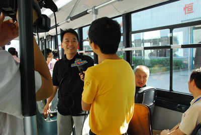 圖為金華電視臺《百姓零距離》欄目在青年牌18米公交車上采訪專家乘坐青年車的感想