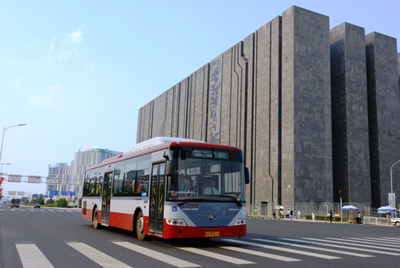 行駛在奧運(yùn)媒體大樓前的大金龍奧運(yùn)專線公交