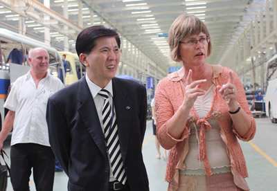 簡短交流過后,凱麗市長在江世煌總經(jīng)理等陪同下參觀了總裝車間。在總裝車間,凱麗市長一行親自體驗了大金龍為廈門公交集團(tuán)打造的BRT車型。在看過大金龍生產(chǎn)情況后,她說,除了金龍產(chǎn)品,大金龍的生產(chǎn)研發(fā)人才讓她欽佩。她表示,將盡所能把大金龍好的產(chǎn)品引見給惠靈頓市民。臨別時,凱麗市長真誠地說:“這是我第四次來廈門,但是來大金龍是第一次,King Long, KL is Kerry Late. 我們應(yīng)該早點來大金龍。”