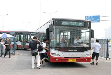 從7月20日起,專為奧運開通的奧運專線就已經(jīng)開始運營!败囎悠、整潔、直達,坐著很平穩(wěn),24小時都開通,挺好的!”來自山 東的曹 先生表示以前沒怎么注意公交車的牌子,這次他特地跑到車前看了看車標(biāo),然后記住了“青年”這個牌子!拔?guī)缀趺磕甓紒肀本,今年又趕上奧運,就想專門坐一次奧運專線車。來了5天了,已經(jīng)去了天壇等處,現(xiàn)在要去天安門。這些地方,坐奧運專線都能到。”