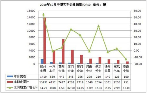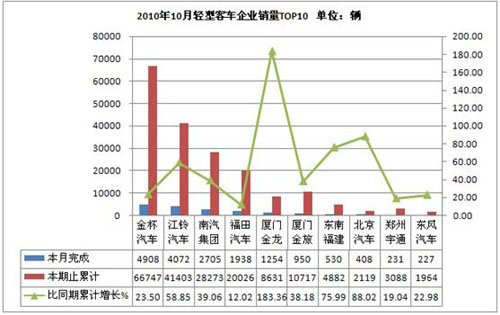 2010年10月客車生產(chǎn)29658輛,累計生產(chǎn)285871 輛,銷售26707輛,累計銷售288941輛,同比累計增長分別為31.15 %和33.57 %。