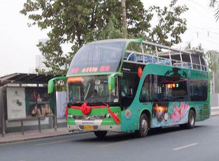 在迎慶祖國60周年大喜之日,濟南城市也迎來了幾位特殊的嘉賓---由黃海客車提供的五部“BIG BUS”雙層觀光旅游巴士新車正式掛花上路。在豪華、舒適、寬敞的大巴里,配有導游提供講解,車內(nèi)每位乘客可獲贈果繽紛一瓶(口味任選),陸續(xù)還將會有免費茶水提供等各項服務。在享受百般“顧客至上”的服務待遇之余,乘客還可沿著游777路線,一覽濟南無限風采。而這些“十一”走馬上任擔綱濟南“旅游大使”使命的黃!癇IG BUS”接下來還將有一個任務,就是做好濟南全運會的交通兼旅游文化傳播工作,為濟南城市樹立一道最為亮麗的風景線。