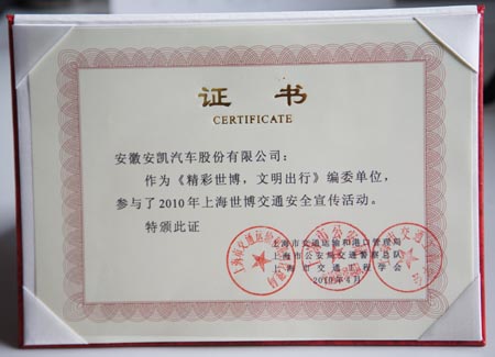 近日,安凱收到了由上海市交通運輸和港口管理局、上海市公安局交通警察總隊、上海市交通工程學(xué)會聯(lián)合頒發(fā)的“《精彩世博 文明出行》——上海世博交通安全宣傳手冊編委單位”的榮譽證書。