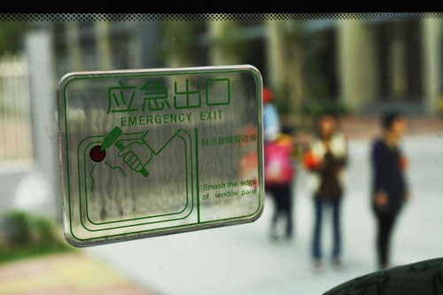 校巴上的安全出口標(biāo)識(shí)。客車的窗簾也不同于傳統(tǒng)的校車用膠帶黏住,而是用一個(gè)細(xì)長的夾子夾住。據(jù)說,這樣可以方便學(xué)生操作。