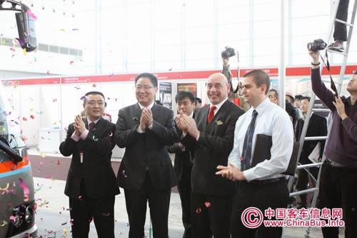 上午10時(shí)許,中國(guó)恒天集團(tuán)張杰董事長(zhǎng)、美國(guó)電車公司丹•雷沃斯博士、百路佳客車有限公司李維董事長(zhǎng)、世界客車聯(lián)盟帕特里克•范•伊姆坡總經(jīng)理,以及來自美國(guó)、敘利亞、約旦等國(guó)家的海外客戶以及國(guó)內(nèi)的客戶、業(yè)內(nèi)的諸位資深人士、行業(yè)媒體等齊聚百路佳展位,共同見證“中國(guó)恒天•百路佳客車有限公司2011出口美國(guó)新品發(fā)布會(huì)”。這是自2006年百路佳JXK6137客車成功首次批量出口美國(guó)后,我國(guó)純電動(dòng)客車首次出口發(fā)達(dá)國(guó)家。