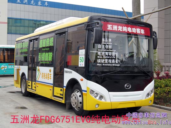 第26屆大運(yùn)會于8月12日在深圳舉行,作為國內(nèi)新能源客車領(lǐng)軍企業(yè)、2011年第一季度新能源客車銷售冠軍、全球最大的新能源客車生產(chǎn)企業(yè)——深圳市五洲龍汽車有限公司將會提供2000多輛新能源客車在深圳公交系統(tǒng)運(yùn)營。在這2000多輛新能源汽車中,就有部分用于支線客運(yùn)的FDG6751EVG型純電動城市客車。FDG6751EVG銷售價格為100多萬元,是全球最小的純電動城市客車,也是最具技術(shù)含量的新能源中型城市客車。FDG6751EVG總長7495 mm,車身寬2340 mm,軸距4800mm,最大座位數(shù)可達(dá)30人,最高車速80 km/h,搭載上海大郡DJ-2103-1-T-100-630-035-W-A0電動機(jī),額定功率和峰值分別為48KW、100KW,并采用磷酸鐵鋰動力電池,總電壓和總?cè)萘糠謩e為336V、300Ah。前后橋采用東風(fēng)德納大承載力精磨橋,裝配6氣囊空氣懸架。