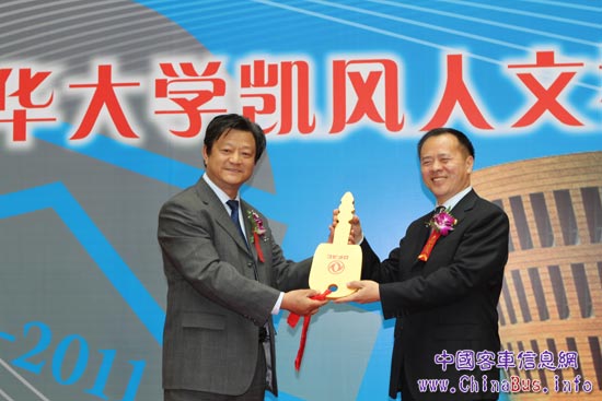 東風股份總經(jīng)理助理朱文燦代表東風汽車股份有限公司將象征著一輛東風天翼純電動物流車的鑰匙交到清華大學人文社科圖書館館長鄧景康手中