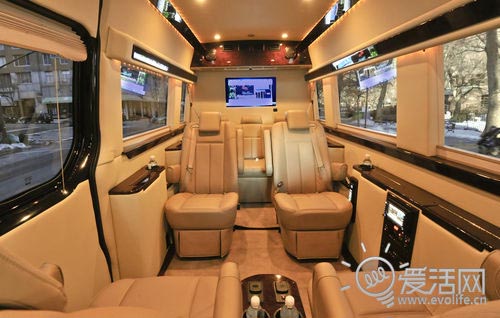 由于是定位于長(zhǎng)途旅行,因此電視自然是少不了,Brilliant Van裝有兩臺(tái)32寸衛(wèi)星電視,而車身兩側(cè)同樣配備了液晶顯示屏,這樣不管哪個(gè)乘客坐在車中都能看到屏幕上的電視畫面,加上八聲道數(shù)碼音響系統(tǒng),不看電視只聽歌也是頂級(jí)享受!同時(shí)車內(nèi)還配有無(wú)線頭戴式耳機(jī),乘客可以在不打擾他人的前提下欣賞電視節(jié)目。而且Brilliant Van在辦公設(shè)備方面也毫不含糊,不僅配備了WiFi網(wǎng)絡(luò)和免提通話裝置,還安裝了一臺(tái)彩色打印機(jī)。